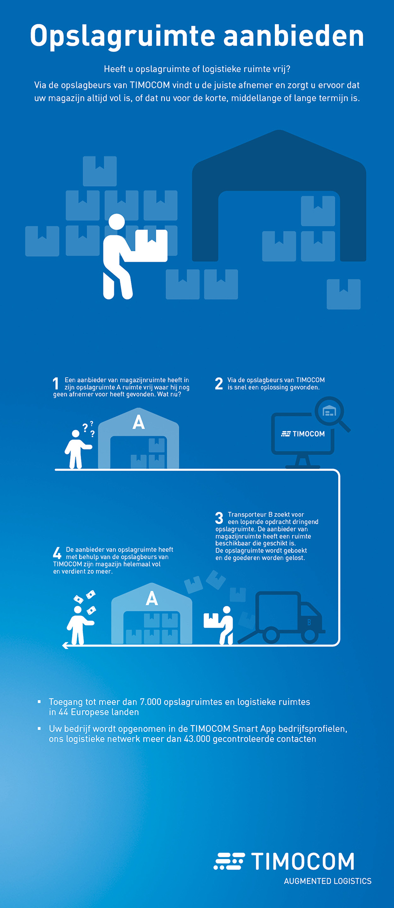 Heeft u een magazijn en wilt u dit optimaal benutten? Of bent u op zoek naar een geschikte opslagruimte? Dan hebben we de oplossing voor u: in ons wegtransport Marktplaats bieden we ook een opslagbeurs aan. Deze beurs is met afstand het grootste B2B-netwerk van verschillende opslagruimtes en opslagtypes in Europa – zonder extra kosten. Als gebruiker van het systeem heeft u automatisch toegang tot meer dan 9.000 opslagruimtes en logistieke ruimtes in 40 Europese landen. U kunt afhankelijk van wat u nodig heeft opslagaanbiedingen ontvangen of plaatsen en meteen met een potentiële zakenpartner in contact komen.